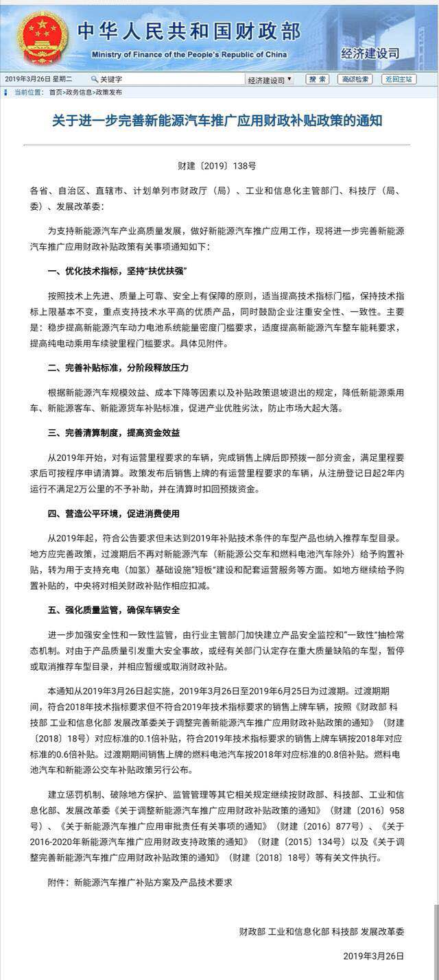 財(cái)政部、工信部、發(fā)改委、科技部聯(lián)合發(fā)布《關(guān)于進(jìn)一步完善新能源汽車(chē)推廣應(yīng)用財(cái)政補(bǔ)貼政策的通知》,通知明確2019年補(bǔ)貼政策從2019年3月26日起實(shí)施。